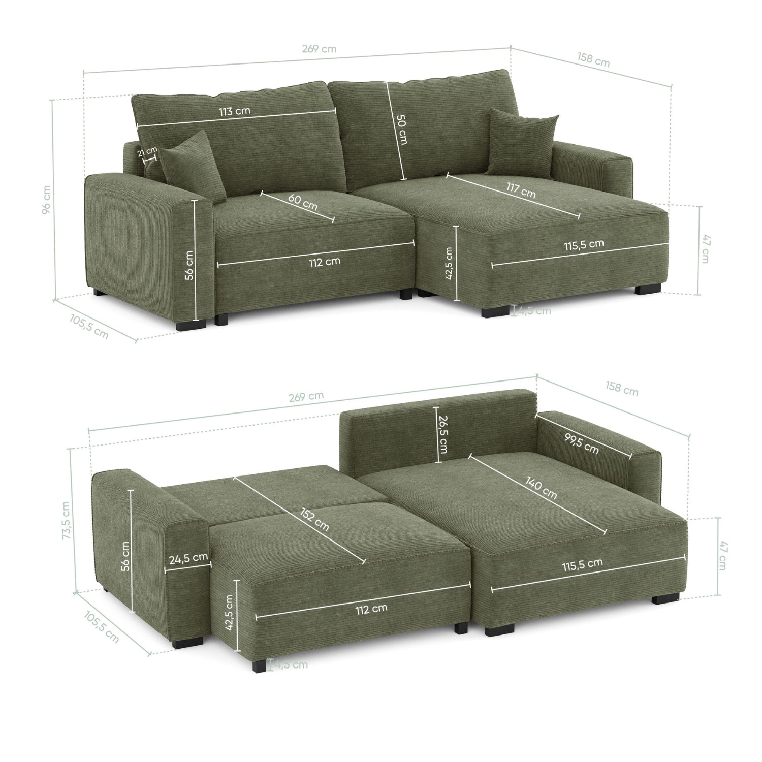 Sofá Cama 4 Plazas con Chaise Longue Reversible, Cojines decorativos y Almacenamiento, Bombazina Verde Bosque