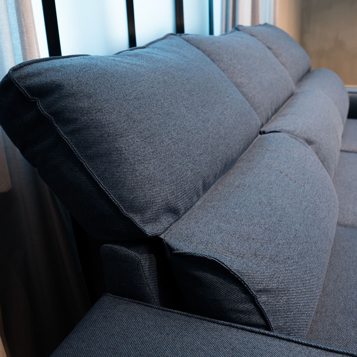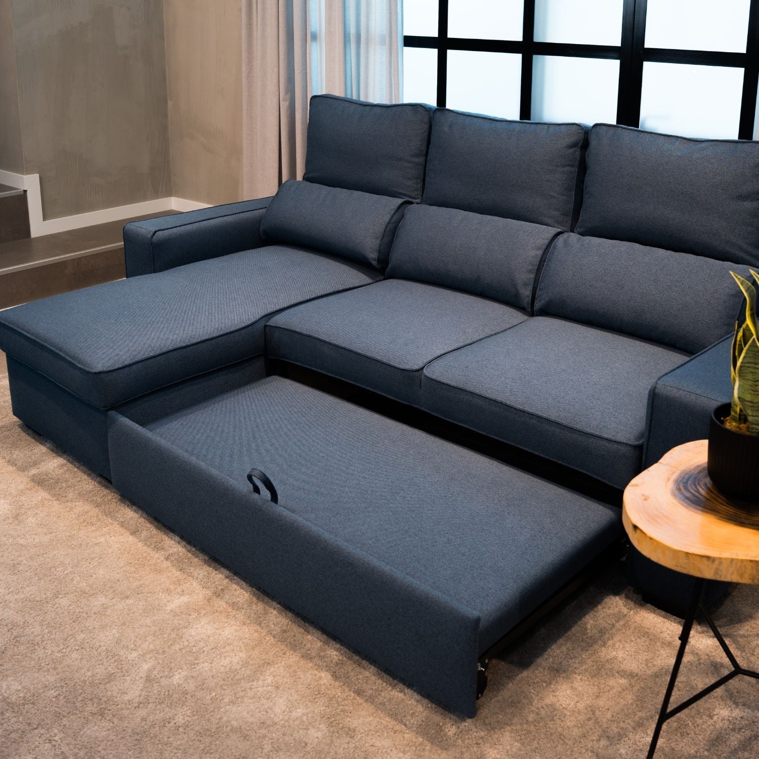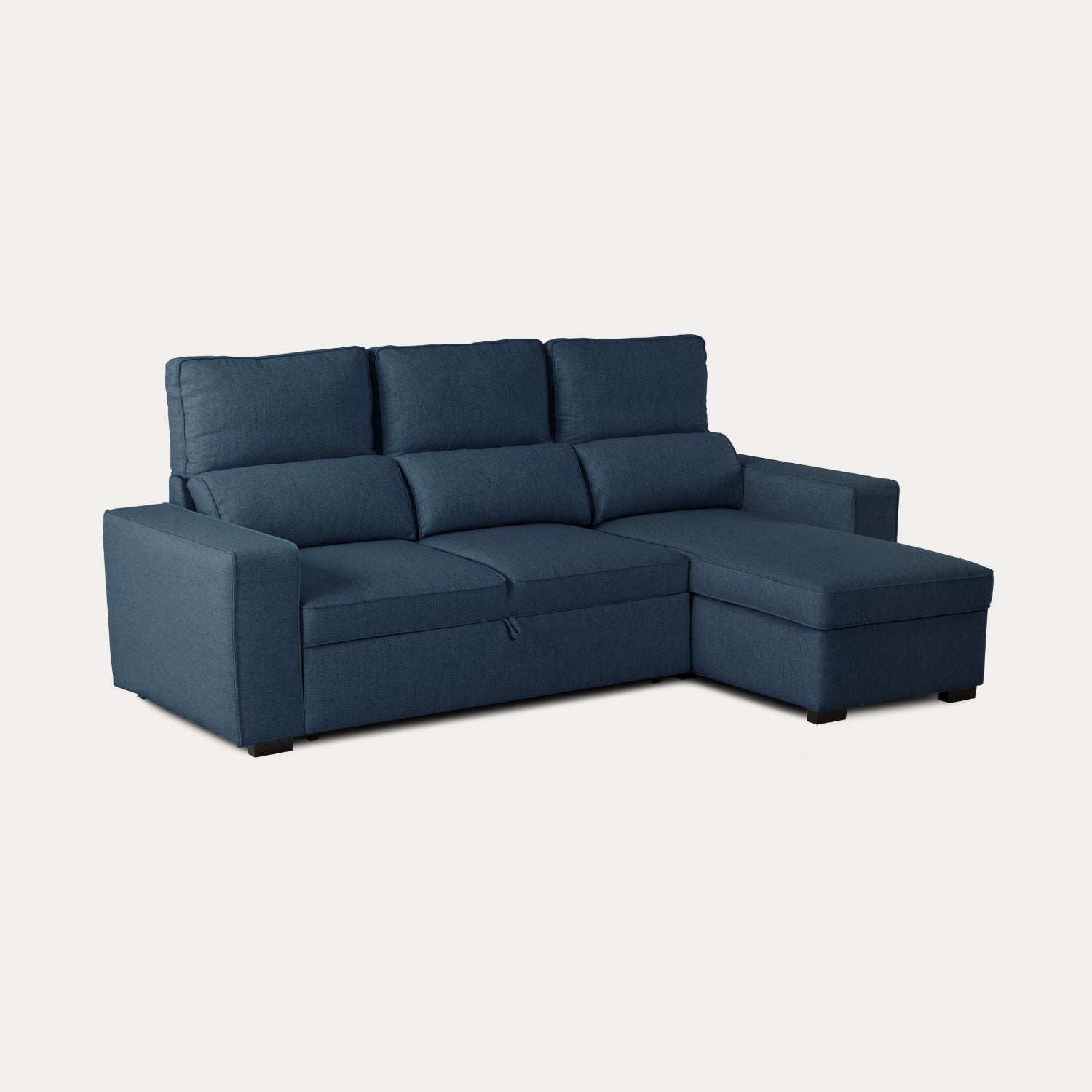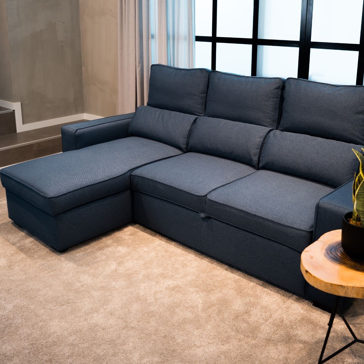 • Divano Letto 4 Posti con Chaise Longue Reversibile, Testiere Regolabili e Contenitore Blu