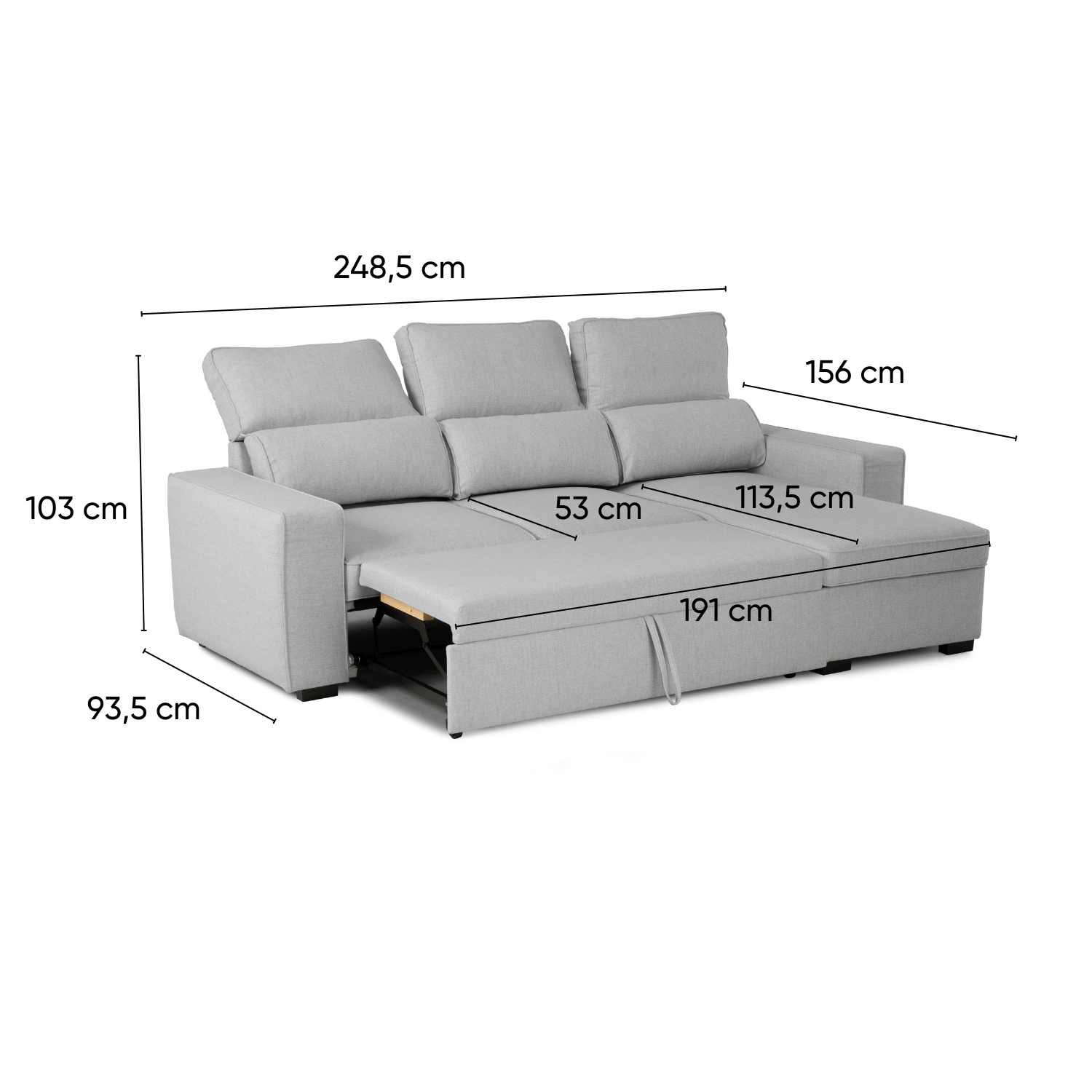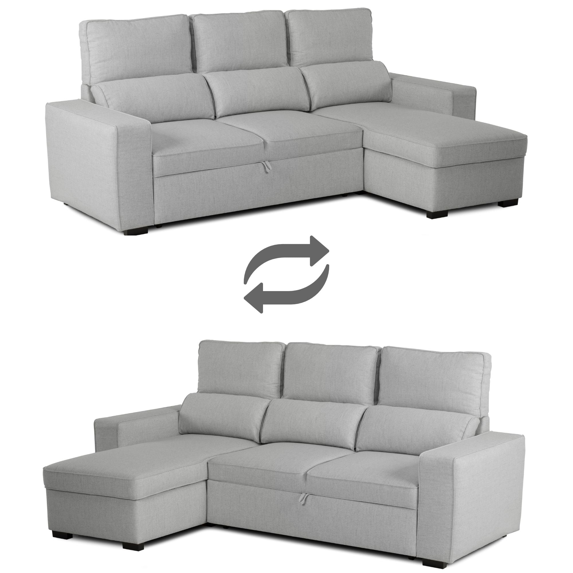 • Divano Letto 4 Posti con Chaise Longue Reversibile, Testiere Regolabili e Contenitore Grigio