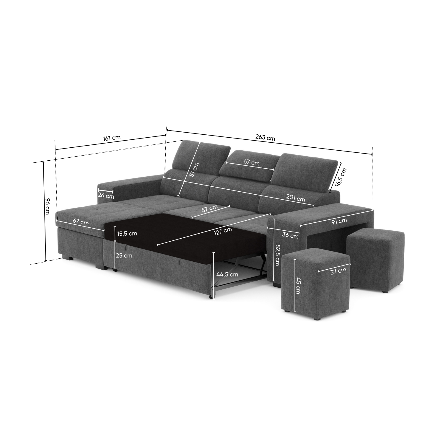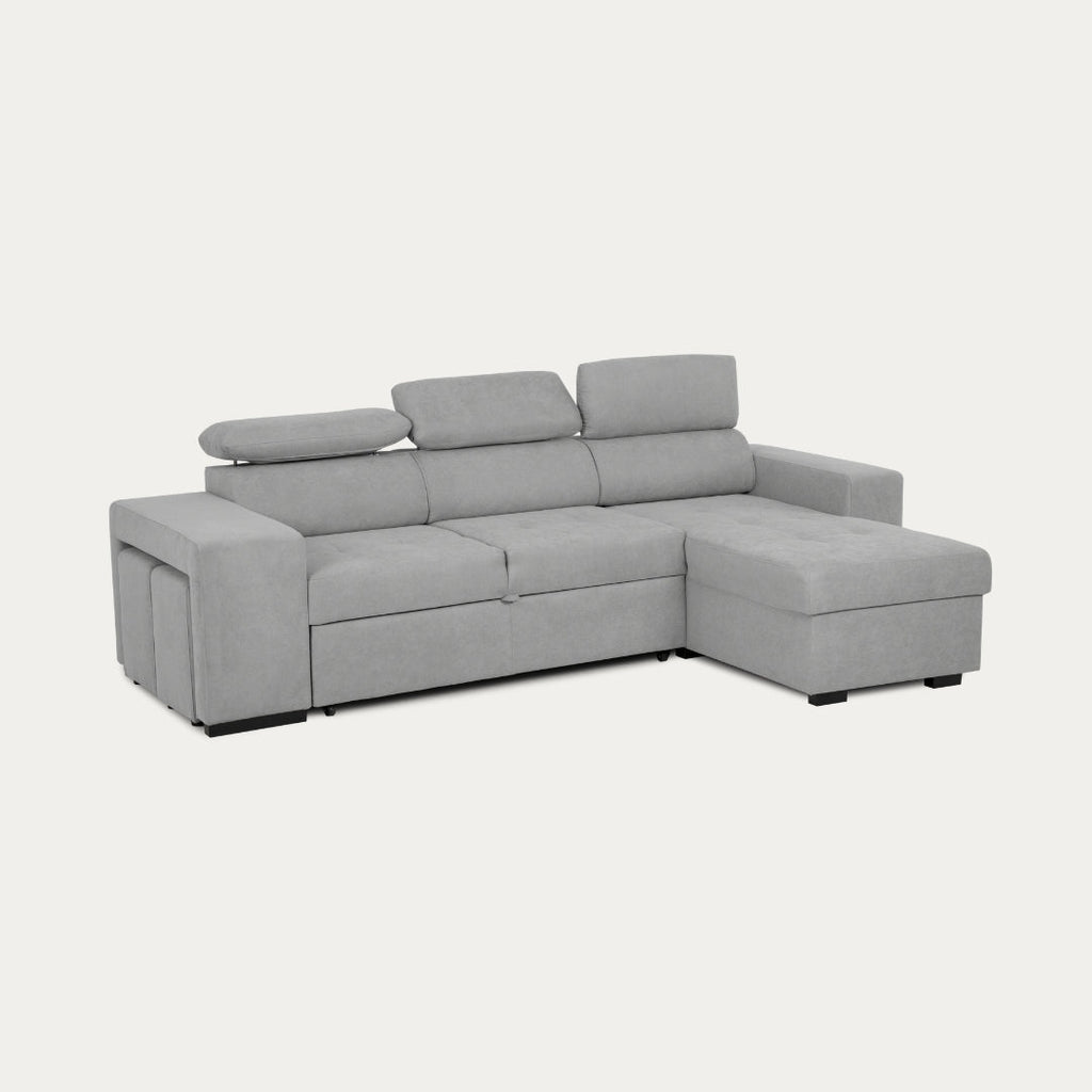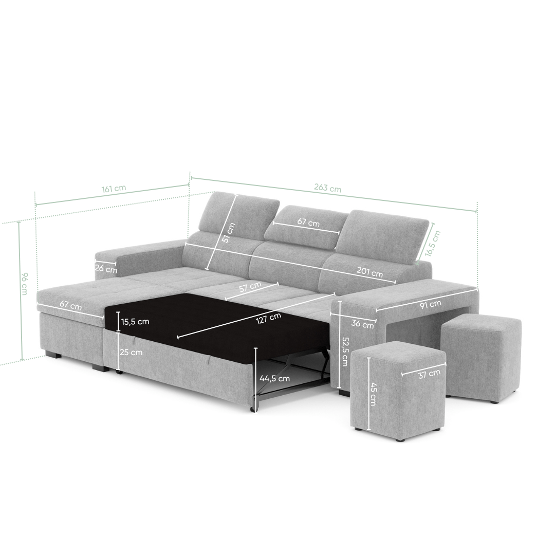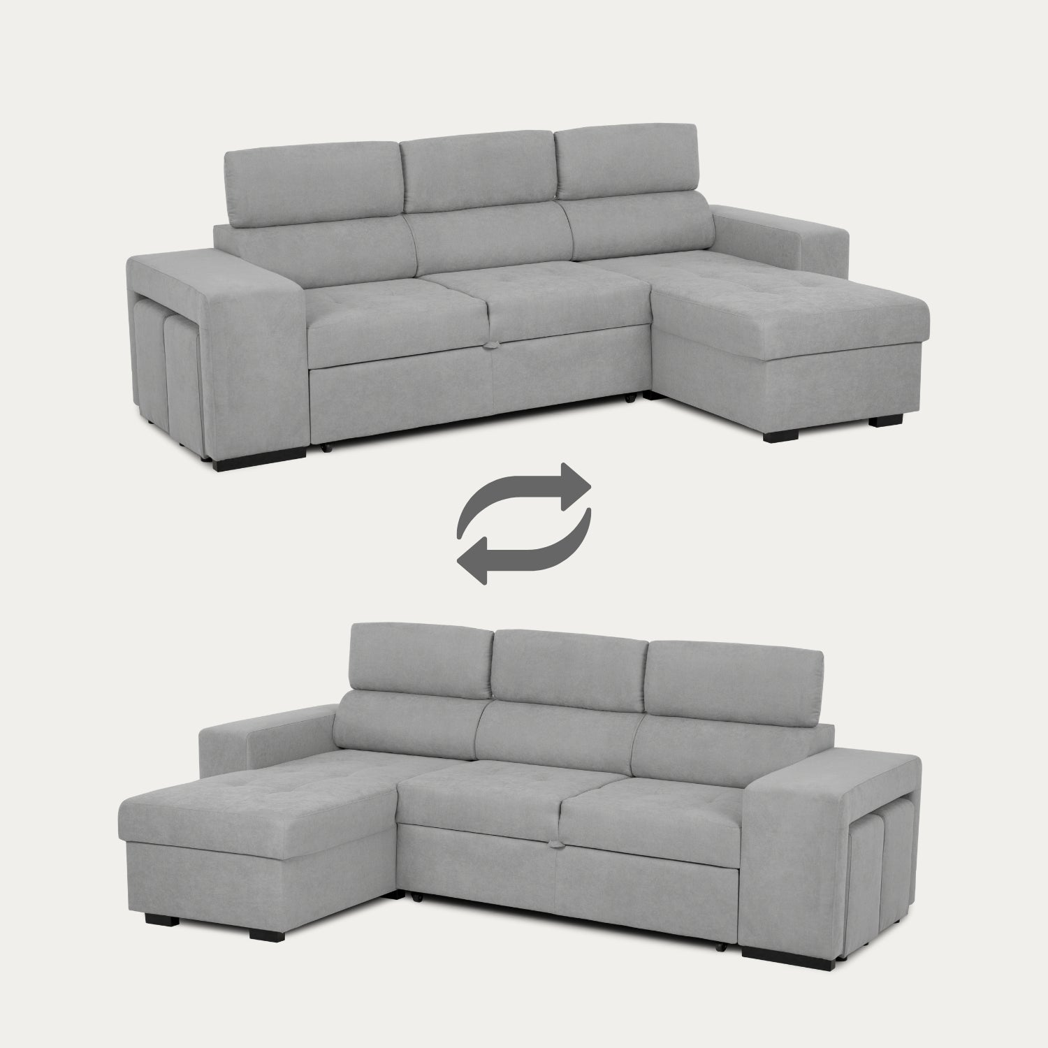 Sofá-cama de 4 lugares com chaise longue reversível, cabeceiras ajustáveis e 2 pufes – John