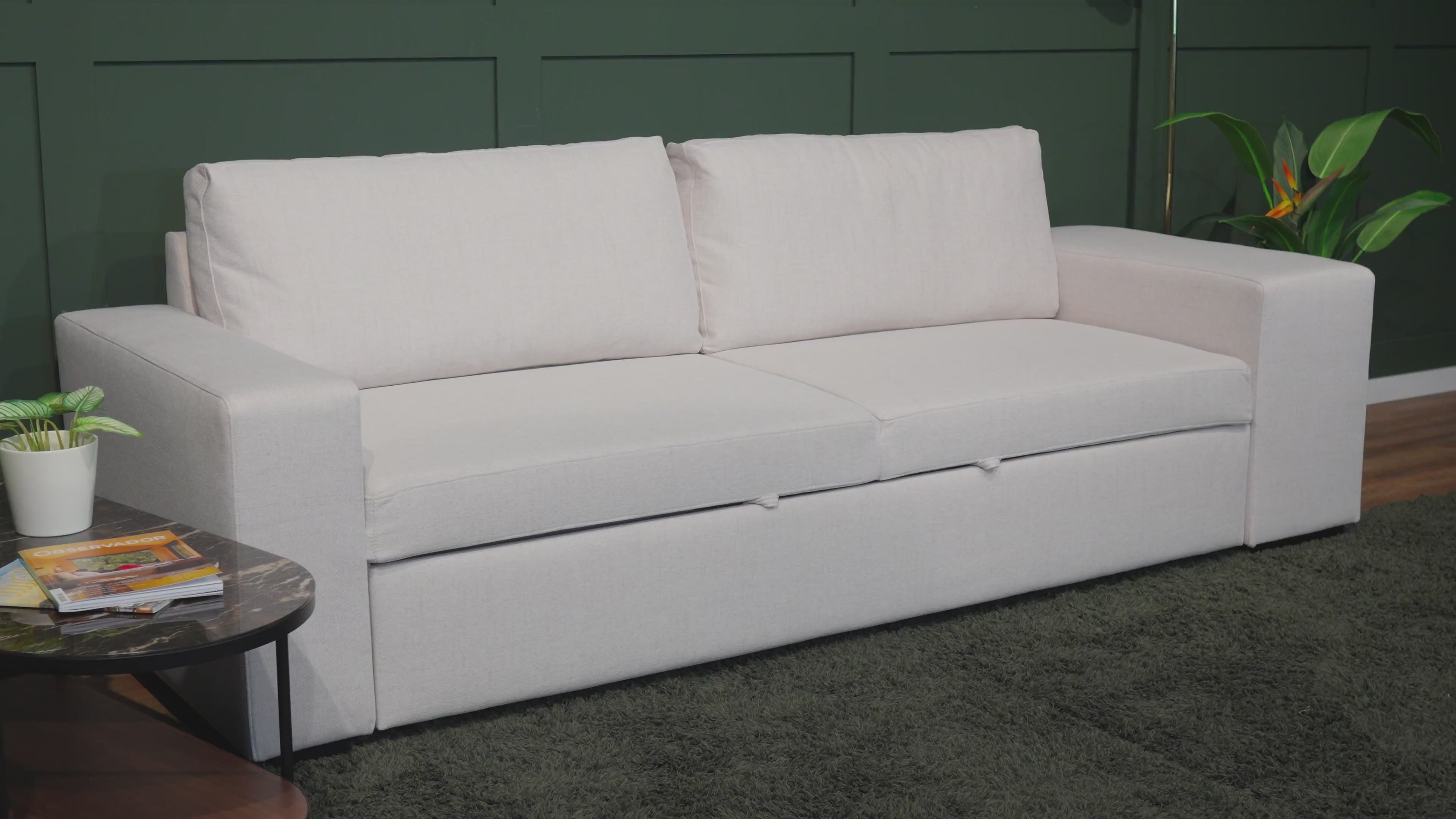 O sistema de cama do AVERY é simples e intuitivo: basta levantar o mecanismo e dobrar as almofadas para transformar o sofá numa cama espaçosa em segundos. É perfeito para situações de emergência ou quando precisa de um conforto extra.