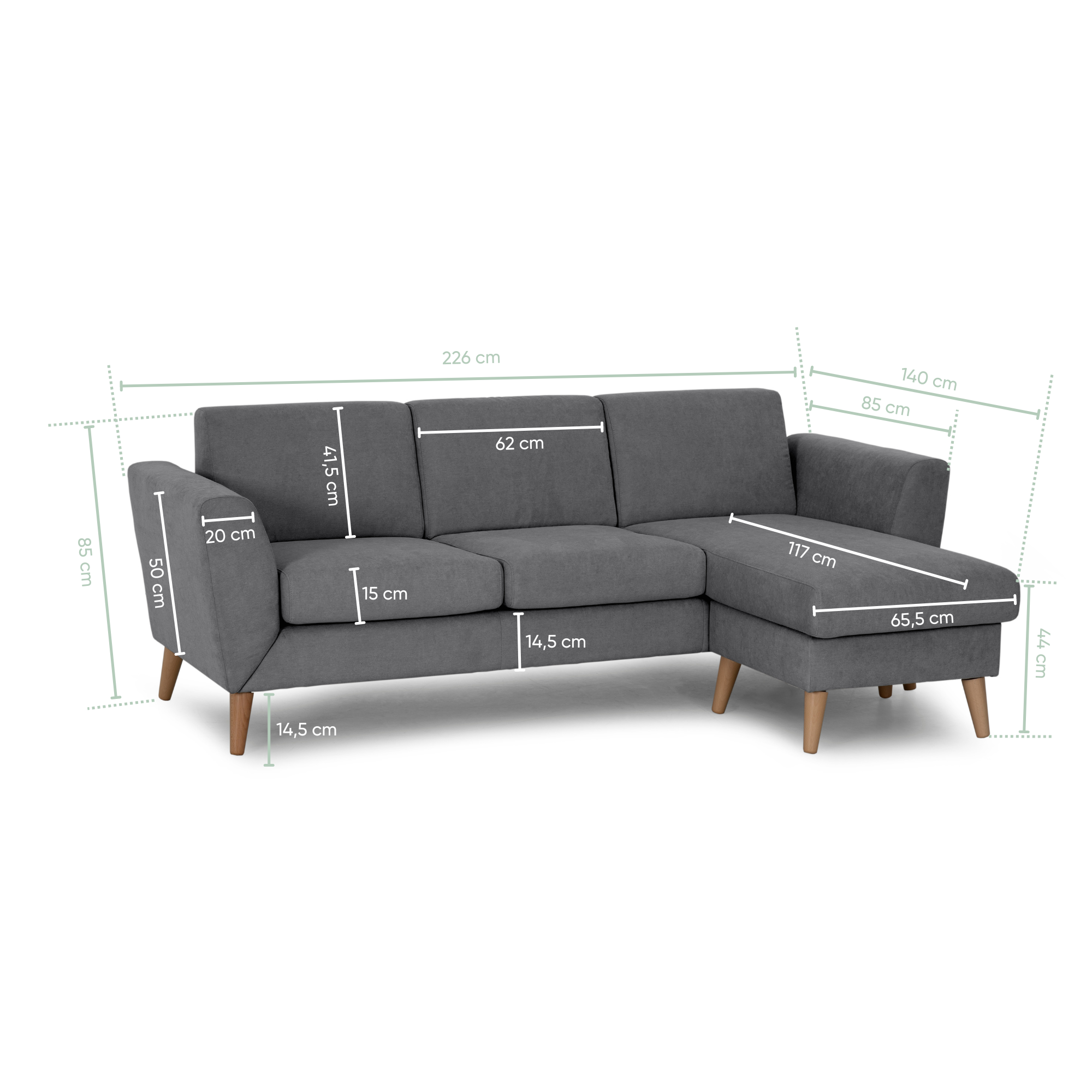 Sofá de 3 lugares com chaise longue reversível e pés vintage – Angel